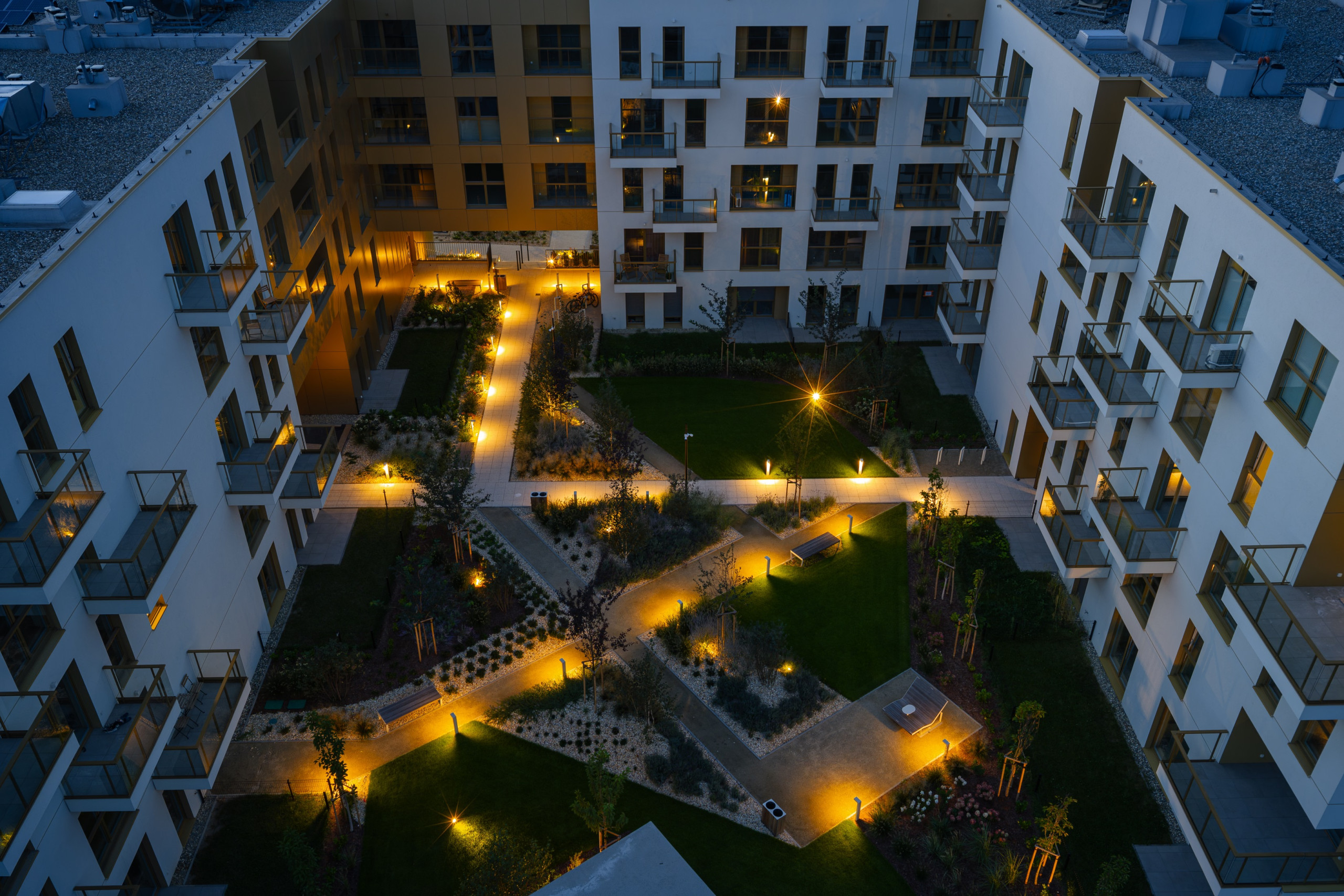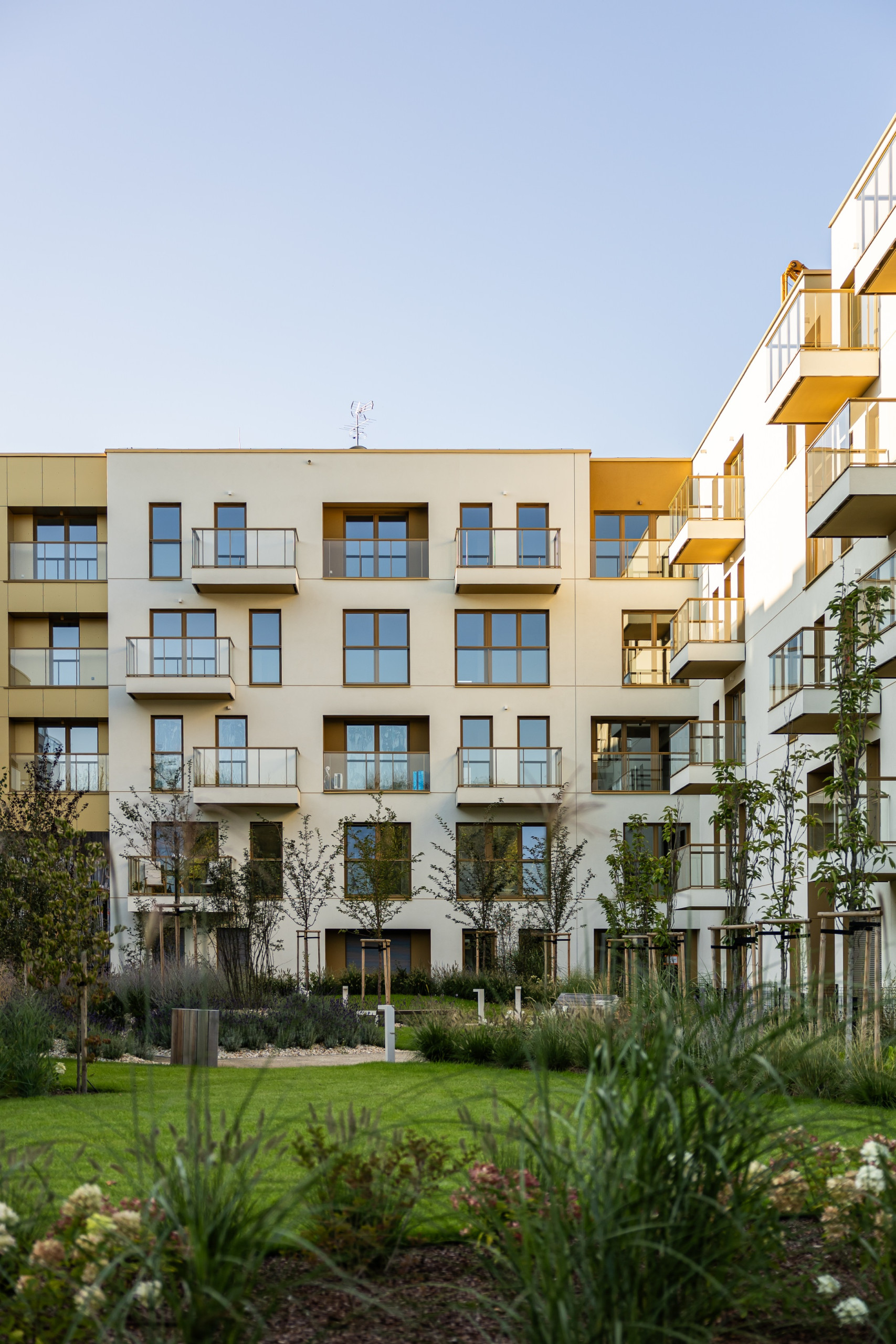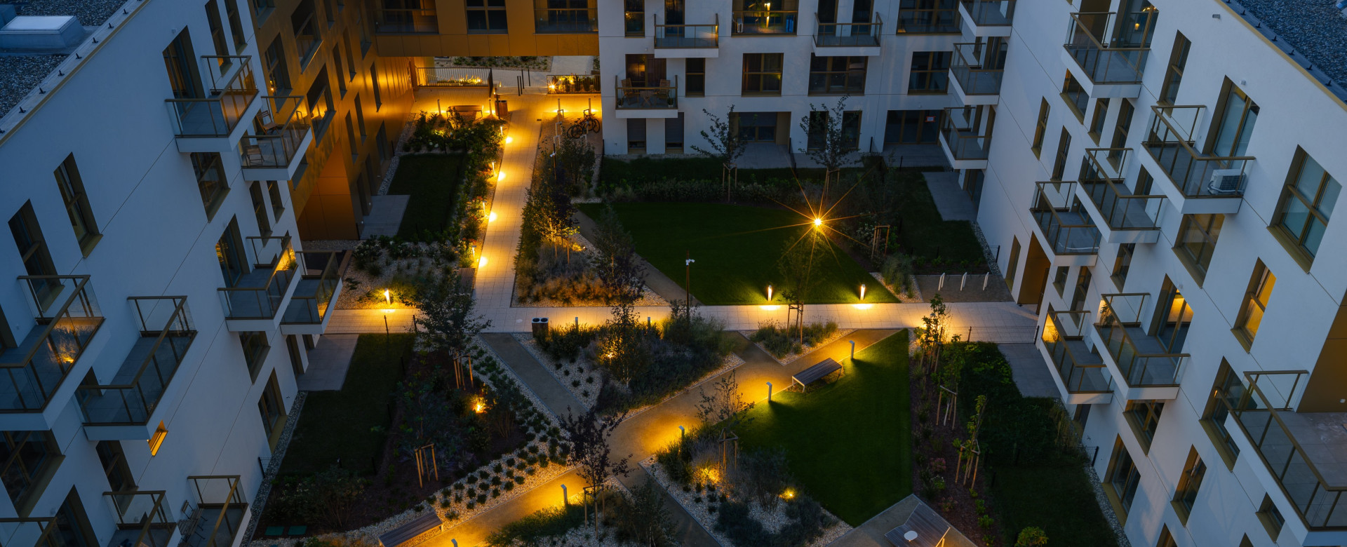 Pierwszy etap inwestycji obejmuje 114 mieszkań o zróżnicowanych układach i metrażach — od 25 do 102 mkw. Budynki będą posiadały układ kaskadowy — od 5 kondygnacji naziemnych z miejscowymi obniżeniami do 4 kondygnacji. Dla mieszkańców osiedla zaprojektowano podziemną halę garażową.